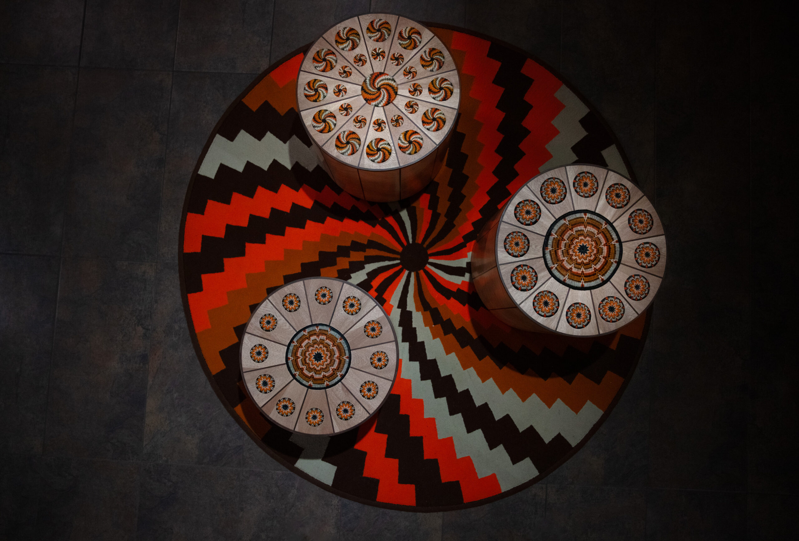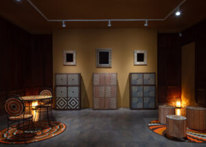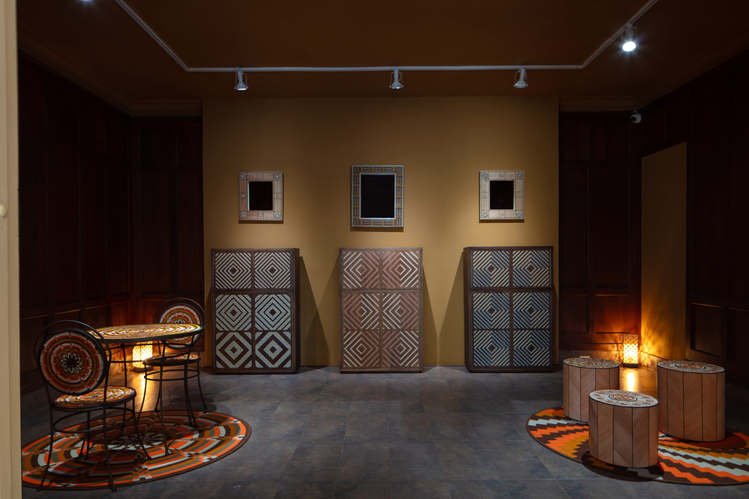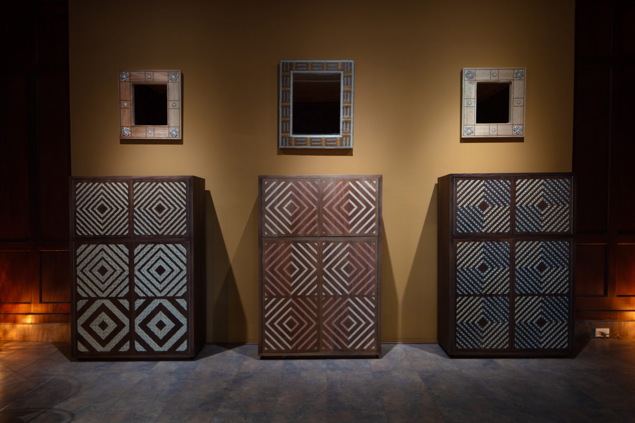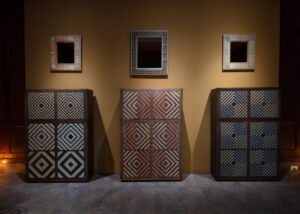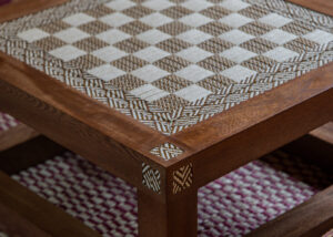 La caña flecha se convierte en marquetería; el tejido de werregue evoca la nobleza de la piedra; el tamo se transforma en un sutil juego óptico que recuerda el papel marmoleado; el tejido de chaquira y de hamaca alude al brillo de la cerámica o a la estructura del mosaico. Otros materiales —como el peyón, la palma estera de Chimichagua, las coronas de Sibundoy o los tejidos asonuushi— se reconfiguran como superficies que engañan la vista y despiertan el tacto.