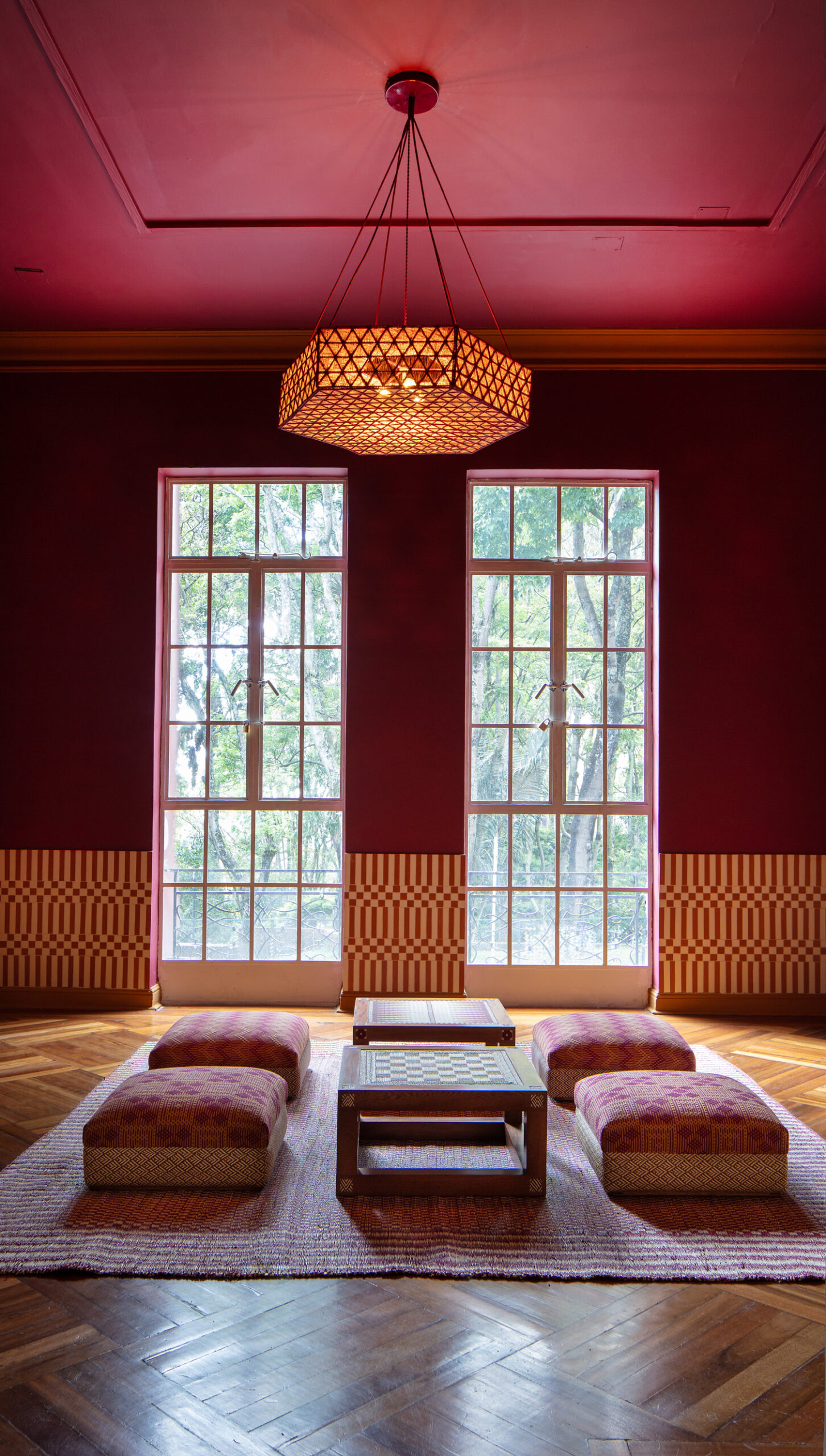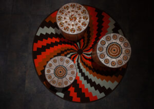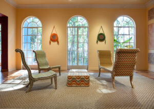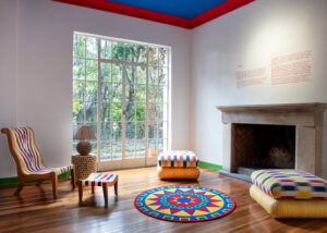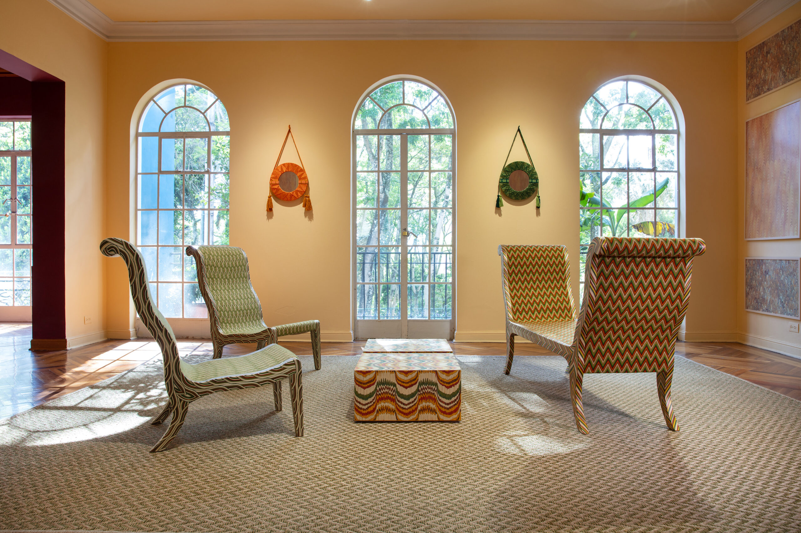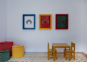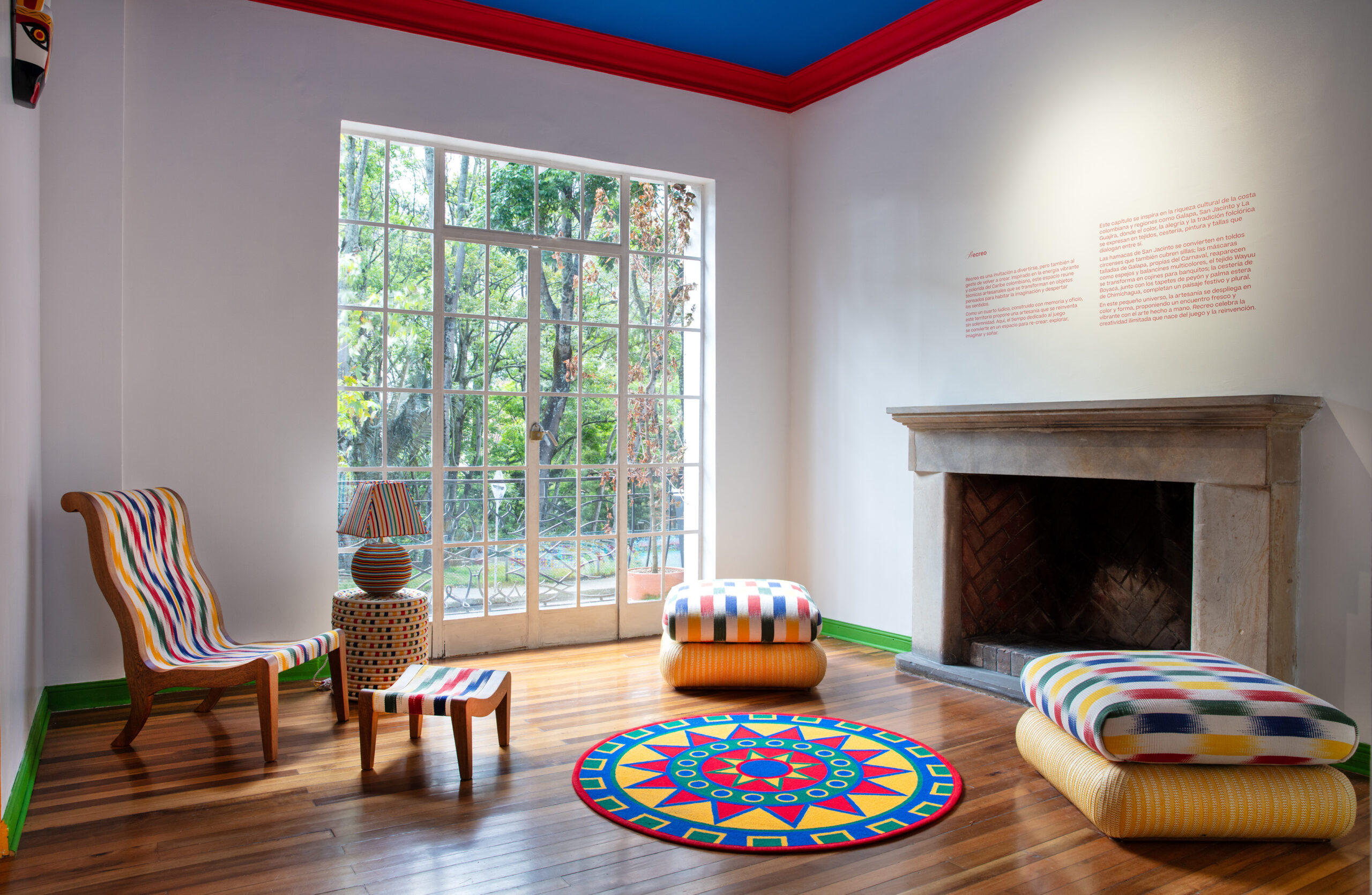 Las hamacas de San Jacinto se convierten en toldos circenses que también cubren sillas; las máscaras talladas de Galapa, propias del Carnaval, reaparecen como espejos y balancines multicolores; el tejido Wayuu se transforma en cojines para banquitos; la cestería de Boyacá, junto con los tapetes de peyón y palma estera de Chimichagua, completan un paisaje festivo y plural.