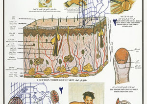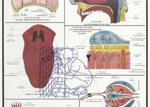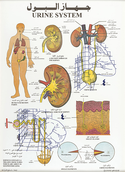 Esta información aparece en afiches en las escuelas de los países árabes, utilizando el mismo lenguaje que las fichas informativas sobre el comportamiento de los órganos y dinámicas del cuerpo humano como el sistema nervioso, la piel, el funcionamiento de la escucha y la vista. Superponiendo estas dos imágenes, se cuestiona la articulación y el diálogo de los diferentes niveles de información que se presentan de forma objetiva en los entornos escolares.