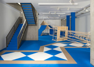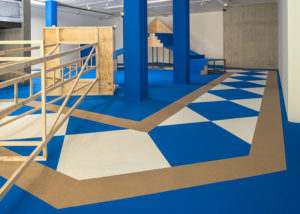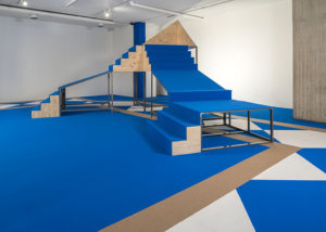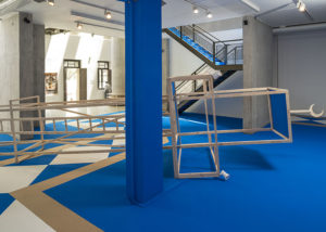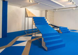 Sobre un tapiz —propio de una sala de oración de una mezquita, o de un aula educativa o incluso de un gimnasio público— que cubre el espacio de NC-arte en su totalidad, se yerguen dos escenografías híbridas.