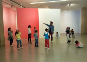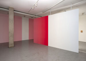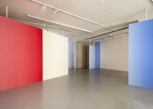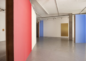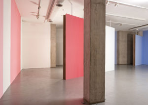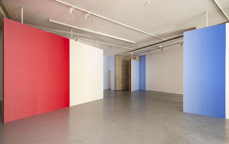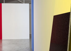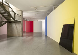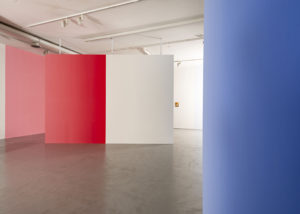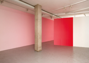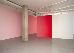 En varias ocasiones Pieter Vermeersch habla de cómo sus proyectos se sitúan en un tiempo suspendido, aquel que ocupa el rectángulo de una polaroid, justo antes de que se forme la imagen. Ese preciso momentum, en donde los pigmentos del revelado y el fijador se entremezclan, es el que quiere fosilizar el artista. Henry Bergson decía que “cada momento, en la medida en que es un pasaje de descanso a descanso, es absolutamente indivisible”. Podríamos hablar de una imagen sin espacio o un espacio construido a través del color; un color que va cambiando del rojo al azul y al amarillo y al blanco, pero que, en definitiva, es un mismo color continuo que se transforma a lo largo de las paredes y contiene distintos pigmentos en uno solo. La pintura deviene un pasaje: la acción de dar pasos, el movimiento de un ir y venir.