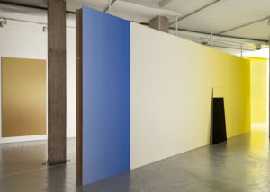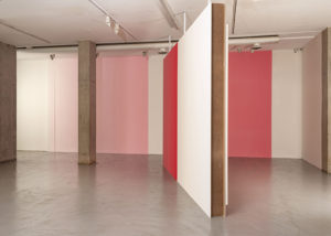 Esto implica una estética relacional subyacente. Y eso se vuelve obvio en las obras a las que Vermeersch se refiere como gradaciones: pinturas monumentales (a menudo murales) que se caracterizan por un cambio gradual del color muy preciso, casi científico, del negro al blanco, del azul profundo al blanco, rojo oscuro a blanco, etc.
